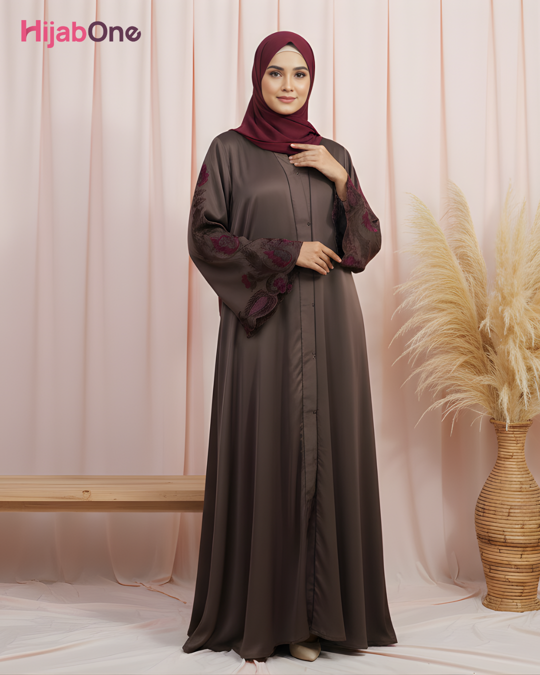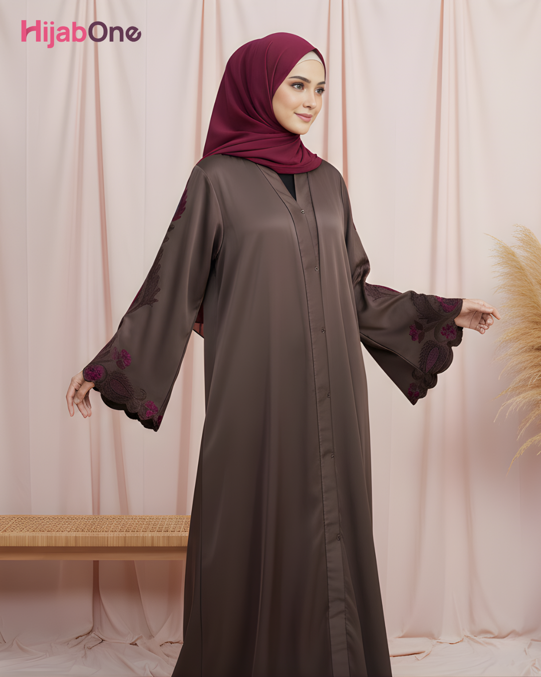 Elegance meets modesty in this Full Length Tich Button V-Neck Abaya, a timeless piece from HijabOne. Crafted in a luxurious mocha brown shade, this abaya features delicate floral embroidery in rich burgundy tones on wide bell sleeves and lower panels, offering a graceful silhouette with artistic detail.