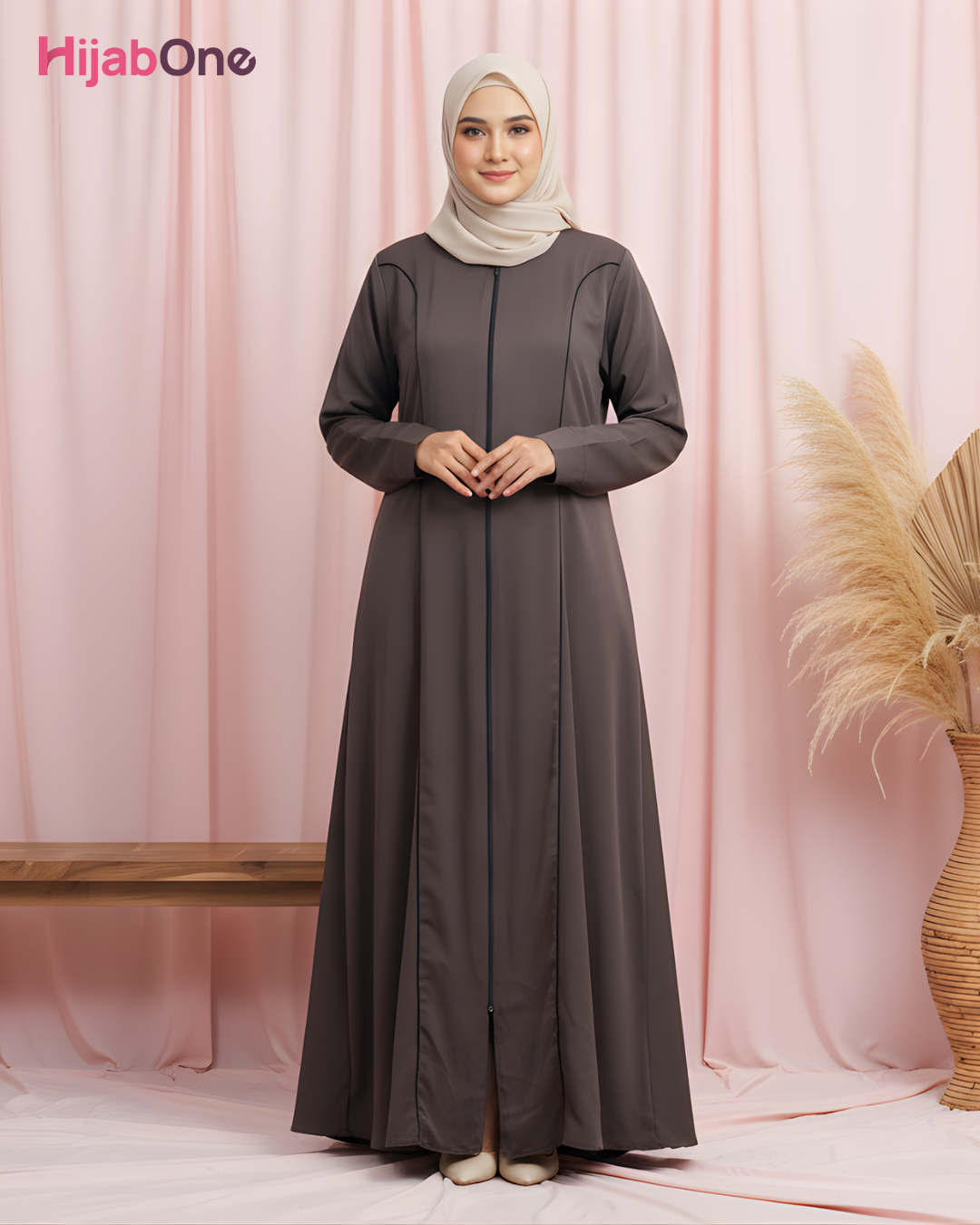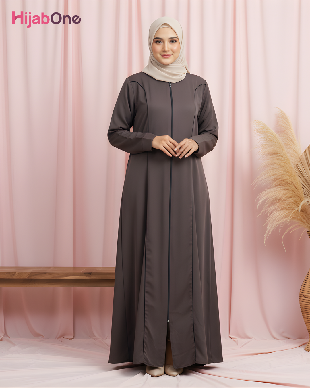 Full-Length Zip Collar Dark Brown Abaya with Black Strip for Women | HIJABONE | H1A004